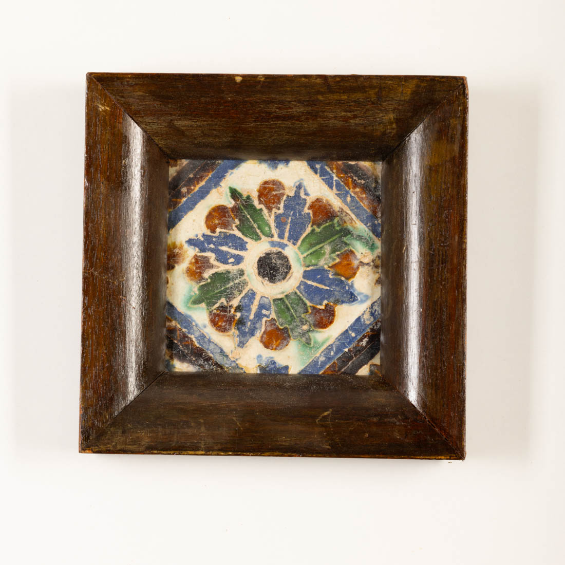 Em cerâmica vidrada, decoração relevada e policromada "florão". Hispano-árabe. Séc. XVI. Emoldurado. Falhas.