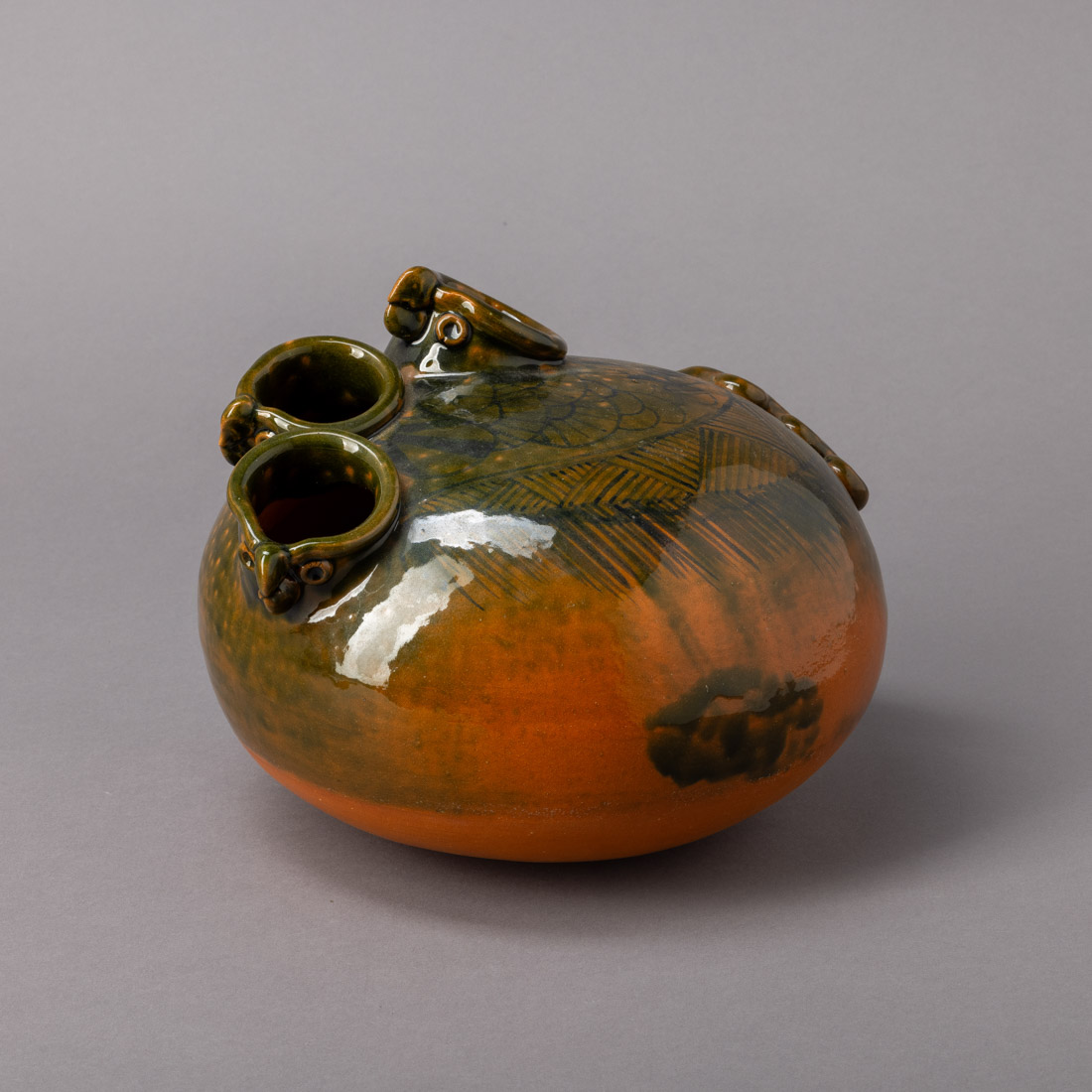 Em barro parcialmente vidrado, decoração a verde com desnhos geométricos. Marcado S. Vicente Cabo Verde e assinada. Sinais de uso.