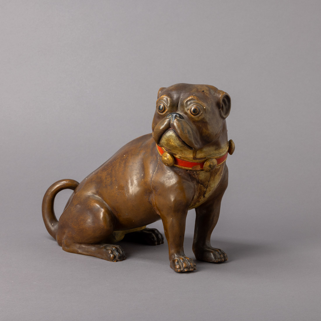 Escultura em cerâmica, decoração policromada. Colagens e pequenas falhas.