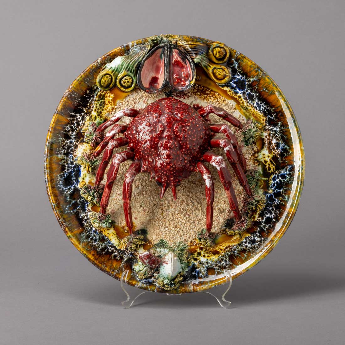 Em cerâmica vidrada possivelmente Caldas, decoração policromada com caranguejo e bivalves em relevo. Craquelé, uma perna do caranguejo colada e pequenas falhas.