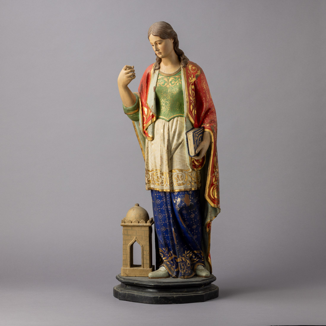 Escultura em madeira policromada e dourada, olhos de vidro. Séc. XIX. Pequenas falhas na policromia e alguns defeitos.