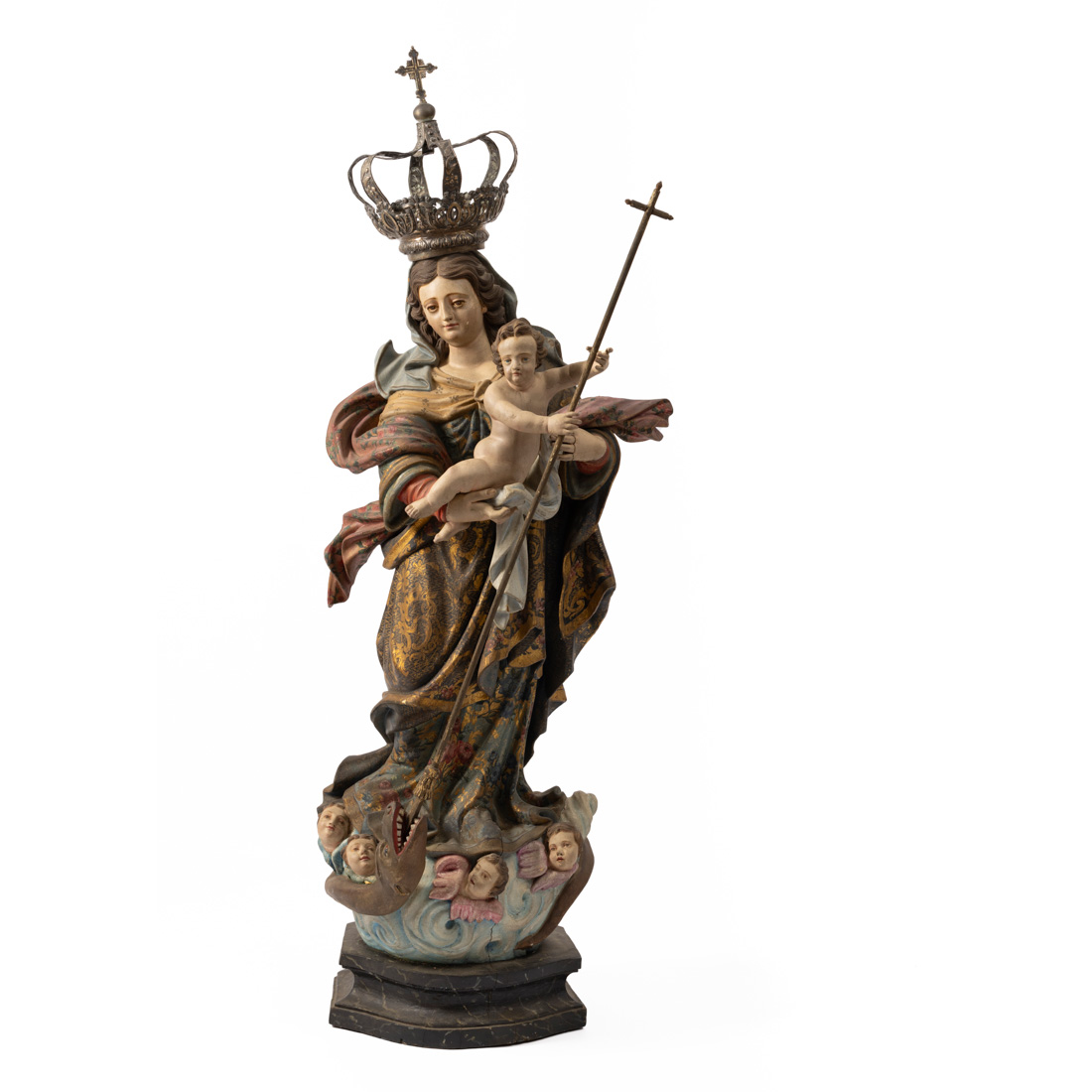 Escultura em madeira policromada e dourada, Séc. XVIII/XIX. Coroa em prata portuguesa Séc. XIX, marca de ensaiador do Porto (P-50) José Almeida Brandão Aguiar Penetra e de ourives (P-419) José Rodrigues Teixeira, decoração relevada e vazada. Representadacom o menino segurando crucifixo que pousa na boca da serpente, sobre nuvem com querubins. Dim: 109 cm.