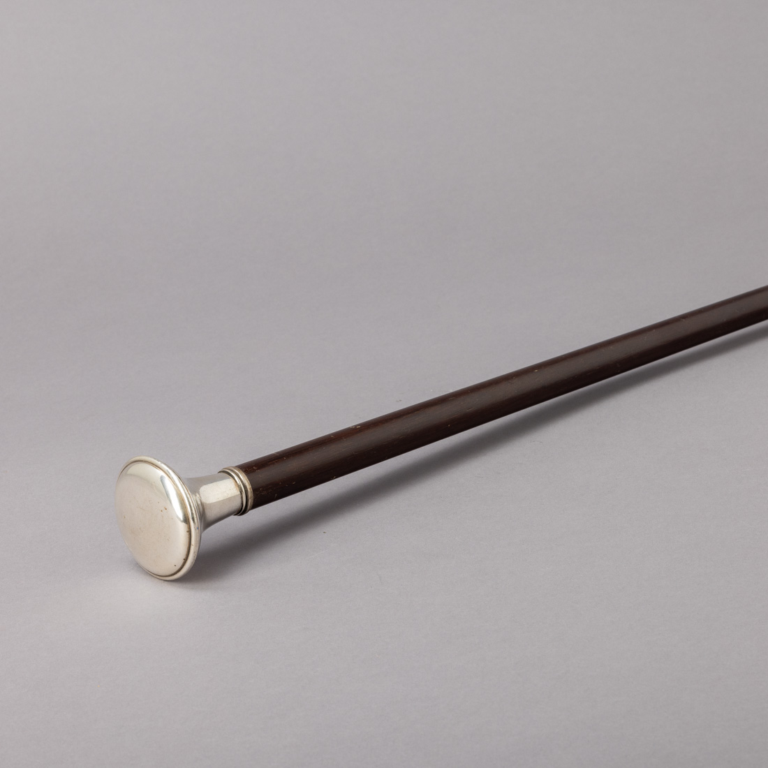 Em madeira exótica, castão e ponteira em prata portuguesa contraste águia (pós 1985) de 835, decoração lisa. Sinais de uso.