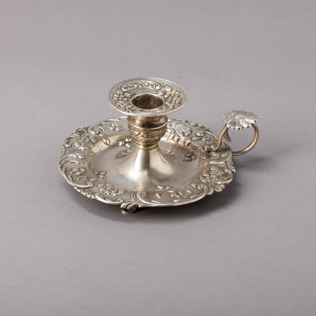 Em prata portuguesa contraste javali (1887-1937) de 833, decoração relevada "flores". Pequenas amolgadelas.