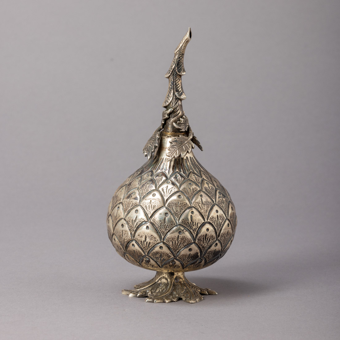 Em prata turca de 900, decoração relevada e gravada. Sem marcas portuguesas, ao abrigo do Decreto-Lei n.º 120/2017. Sinais de uso.