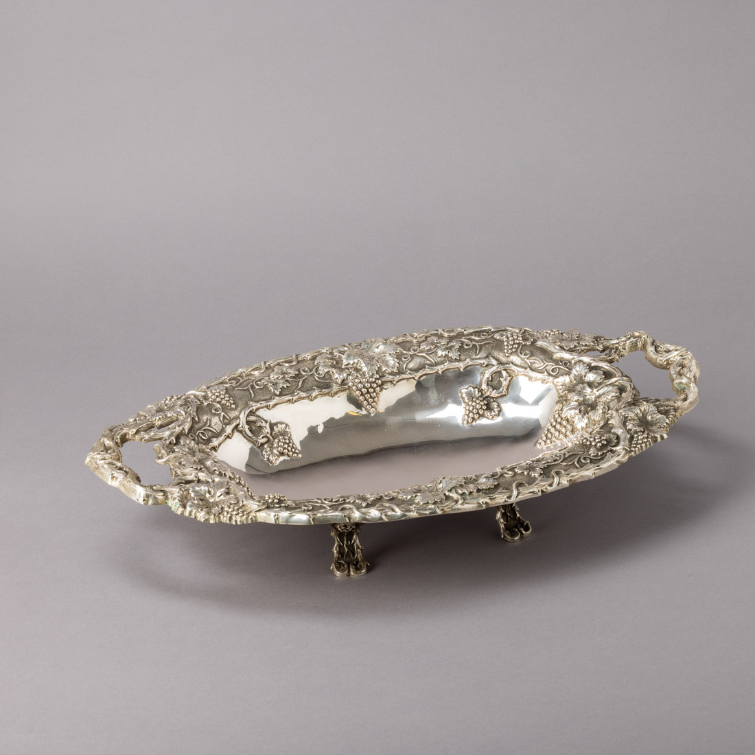 Em prata portuguesa contraste javali (1887-1937) de 833, marca de ourives do Porto (2355) José Matos Viegas, decoração relevada, vazada e cinzelada "parras e uvas". Sinais de uso.