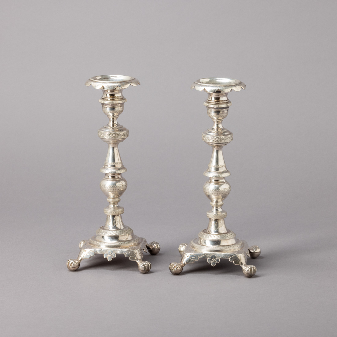 Em prata brasileira do Séc. XIX, marca de título de dez dinheiros do Rio de Janeiro (BR-48) e de ourives (BR-112) Guimarães & Cruz, decoração gravada com elementos vegetalistas, pés de garra. Sinais de uso.