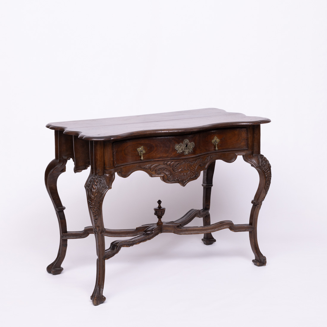 Em castanho com entalhamentos, tampo e saiais recortados, pernas curvas unidas por travamento em X com pinha. Falhas, defeitos e vestígio de xilófagos.