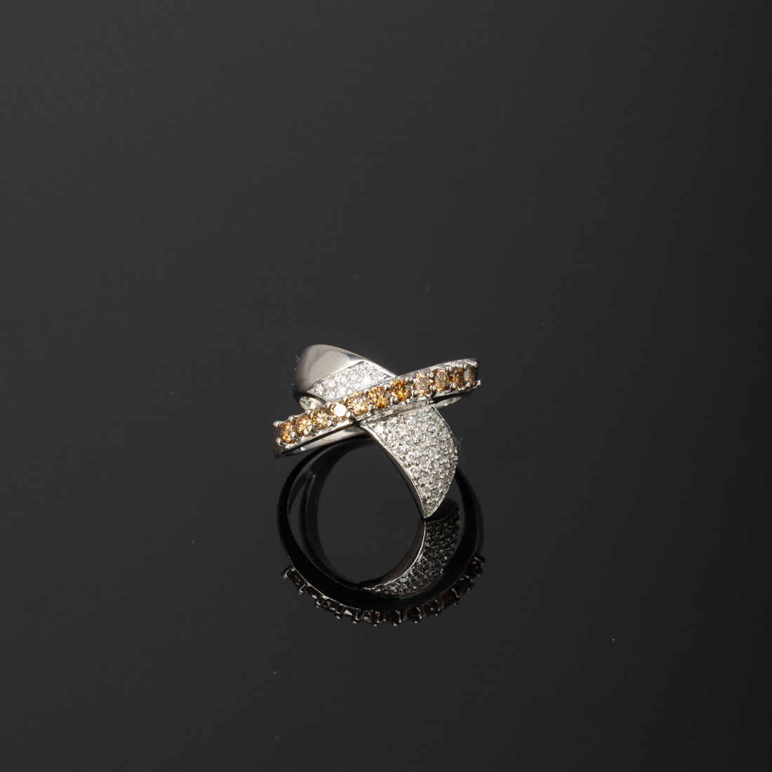 Em ouro branco português de 19,2Kt., contraste veado (pós 1985) cravejado com diamantes em talhe brilhante tom champanhe e incolor. Sinais de uso.
