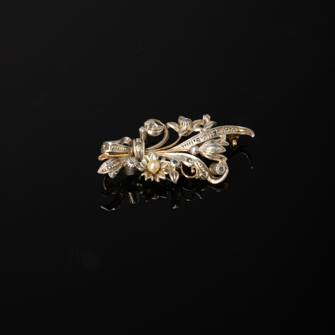 Em ouro português de 19,2Kt., e prata contraste cão e galo (1938-1984) cravejada com diamantes talhe rosa e pérola. Sinais de uso.