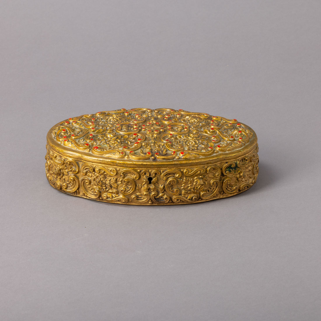 Em metal amarelo dourado com realces a vermelho, decoração relevada com motivos florais e enrolamentos, interior forrado a veludo bordeaux, marcada Barbeitos. Sinais de uso.