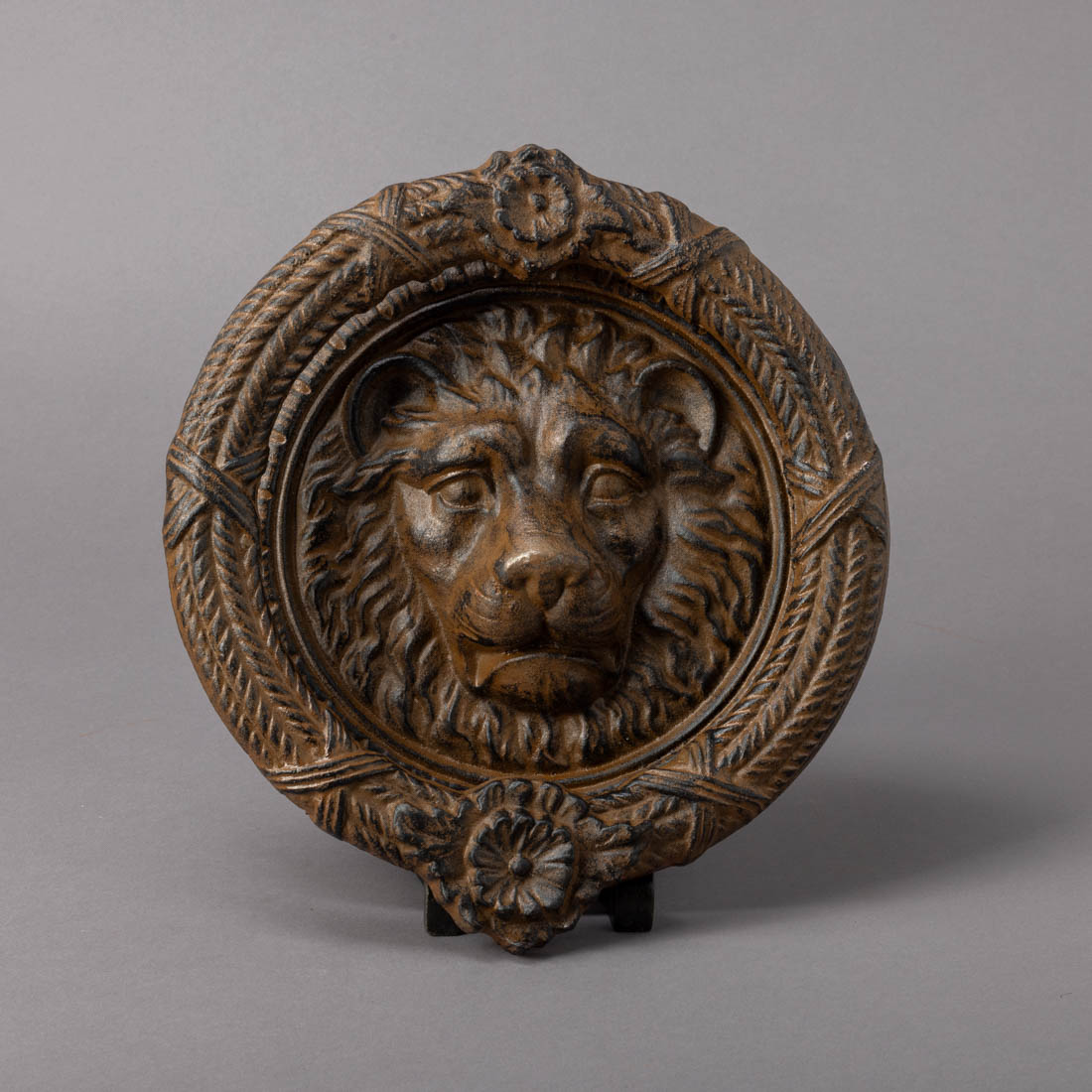 De grandes dimensões, redondo, em ferro, decorado com cabeça de leão. Sem uso.