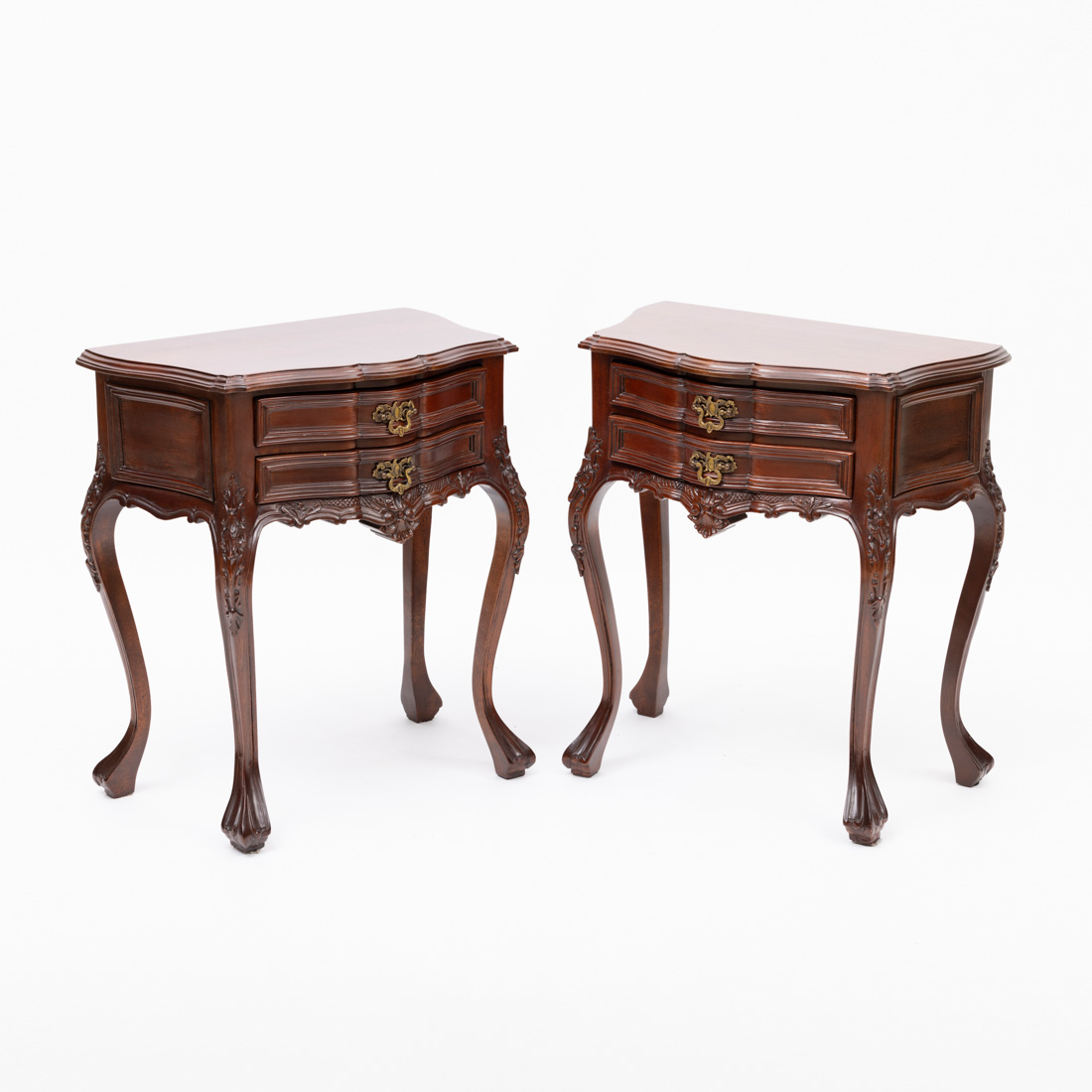 Estilo D. José, em diferentes madeiras com entalhamentos, pernas curvas, tampos recortados. Sinais de uso, pequenos defeitos.