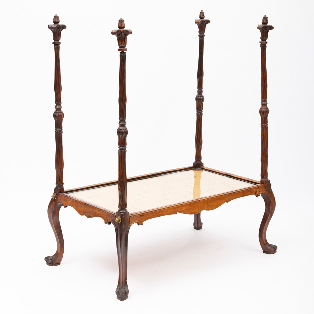 Em pau santo com entalhamentos, tampo em vidro. Possivelmente adaptação de uma cama de dossel D. José de criança. Pequenos defeitos.