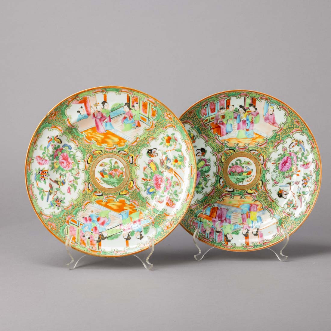 Em porcelana da China, Séc. XIX/XX decoração "Mandarim" policromada e dourada, reservas com cenas do quotidiano, flores e insectos. Sinais de uso e um com esbeiçadela.