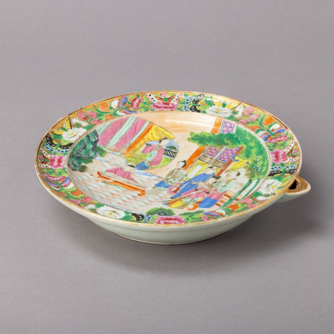 Em porcelana da China, Séc. XIX, decoração "Mandarim" policromada e dourada, com cena do quotidiano, na aba flores, frutos e borboletas. Falta uma pega e ínfimas esbeiçadelas.