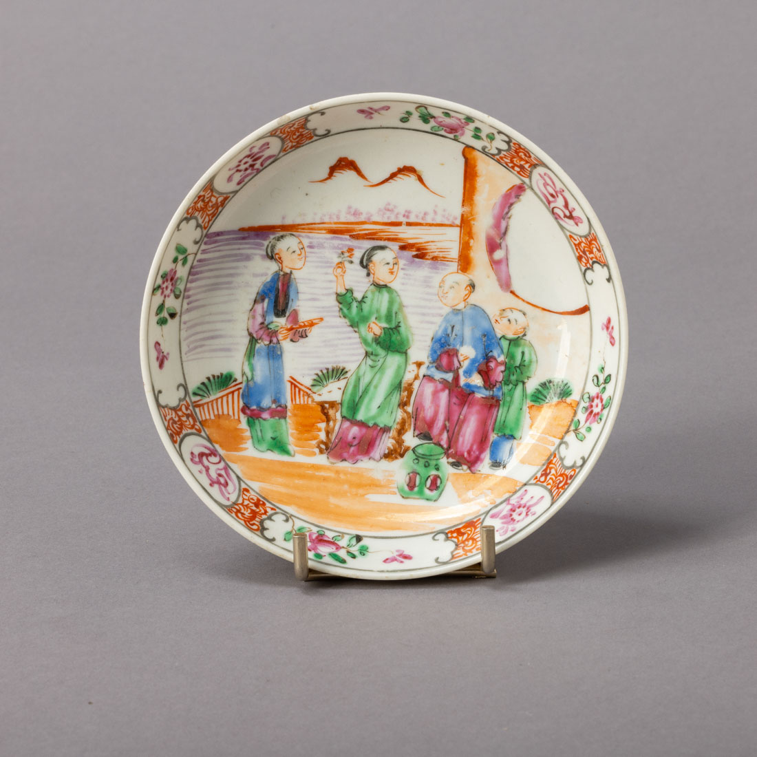 Em porcelana da China Companhia das índias, Séc. XVIII, decoração policromada "Paisagem com figuras". Sinais de uso e pequenas esbeiçadelas.