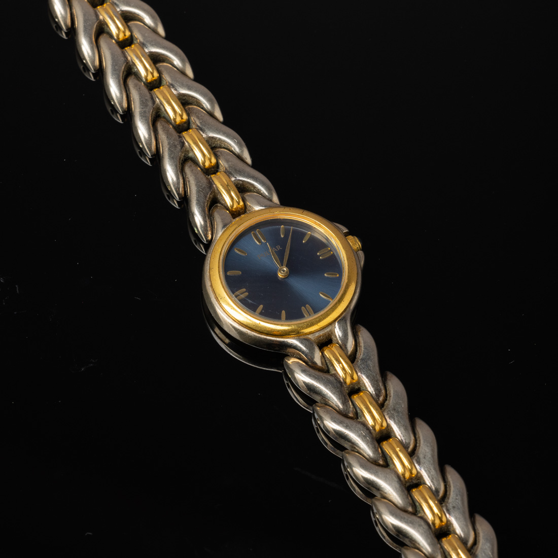 Caixa em aço, mostrador de fundo negro, movimento a quartzo. Em marcha.