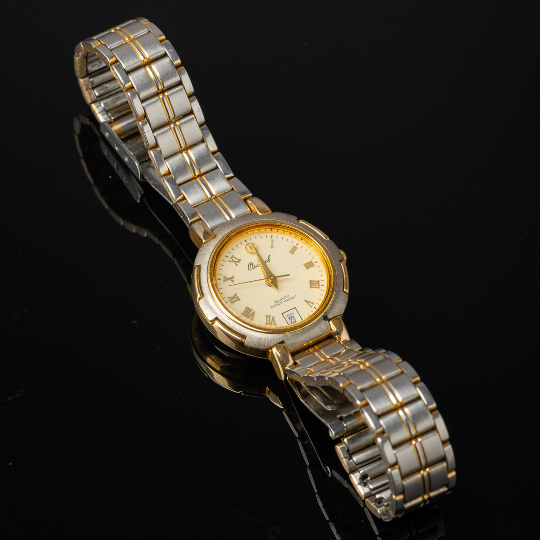 Caixa e bracelete em aço, mostrador com data e numeração romana, movimento a quartzo. Em marcha.
