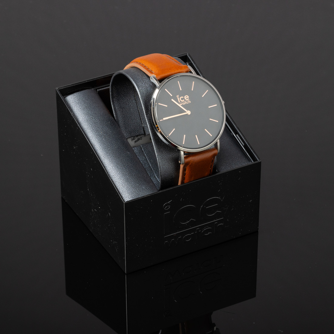 Caixa em aço, mostrador de fundo negro, movimento a quartzo. Em marcha. Caixa original e documentos.