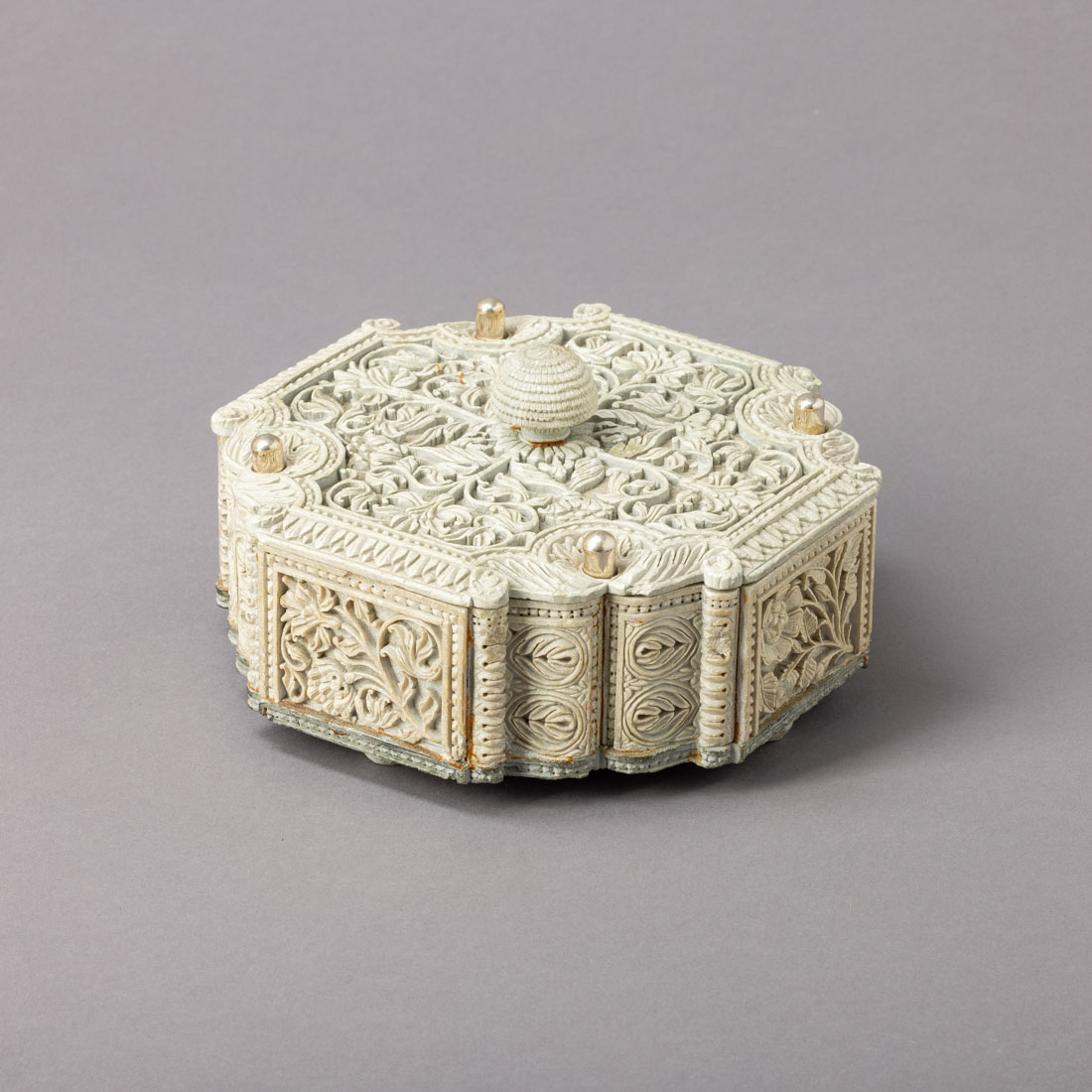 Em pedra dura, decoração relevada com elementos vegetalistas. Sinais de uso e pequenas falhas.