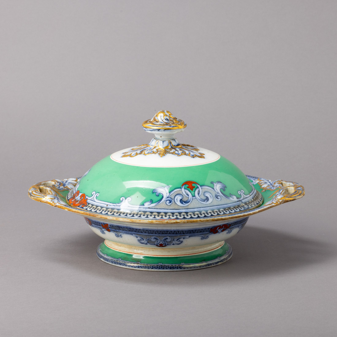 Em loiça pó de pedra marcada Davenport, decoração "Dresden Star" policromada e dourada com enrolamentos e elementos vegetalistas. Séc. XIX/XX. Sinais de uso, tampa com cabelo.