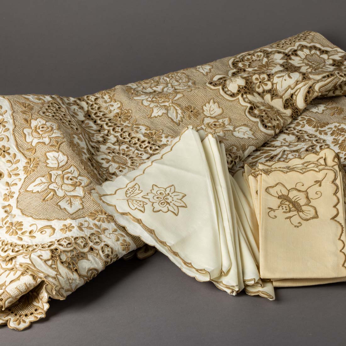 Em linho bordado, de excepcional qualidade, com selo de certificação em metal, companha 24 guardanapos diferentes. Sinais de uso e pequenas manchas.