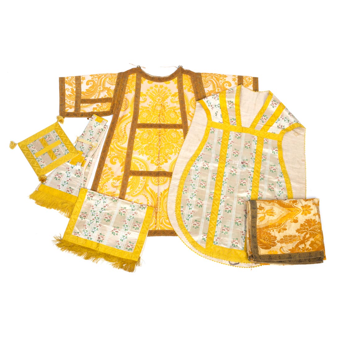 Em seda brocada e adamasca com galões. Composto por casula, capa de asperges, duas estolas, panos de armar. Sinais de uso, manchas e defeitos.