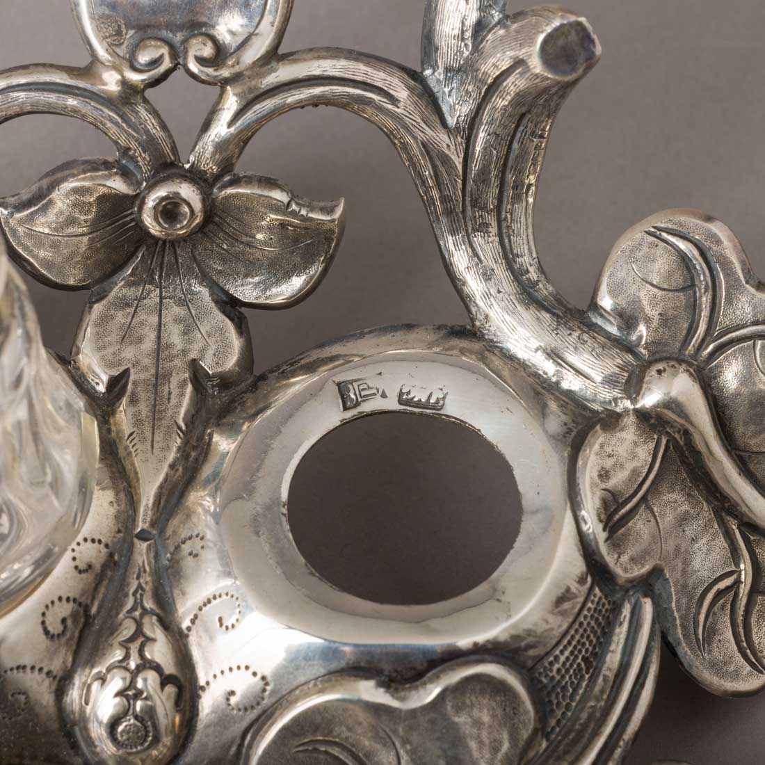 Em prata portuguesa do Séc. XIX, marca de ensaiador do Porto (P-63) José Rodrigues Teixeira e de ourives (P-403) José Marques Guedes, decoração relevada com folhagem, recipientes em vidro (um com cabelo), tampas em prata javali. Peso aprox.: 143 g. (só prata) Dim: 9x17,5 cm.