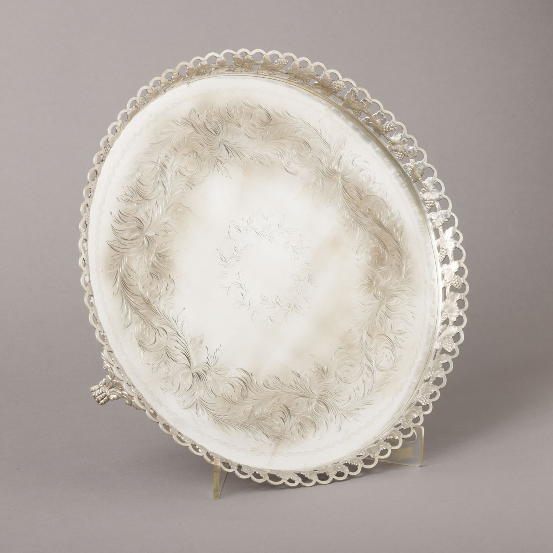 Em prata portuguesa do Séc. XIX, marca de ensaiador do Porto (P-49) José de Almeida Brandão Aguiar Penetra e de ourives (P-341) de 1810-1877, decoração gravada "elementos vegetalistas", gradinha vazada e pés de garra. Sinais de uso. Peso aprox.: 880 g. Dim.: 31 cm.