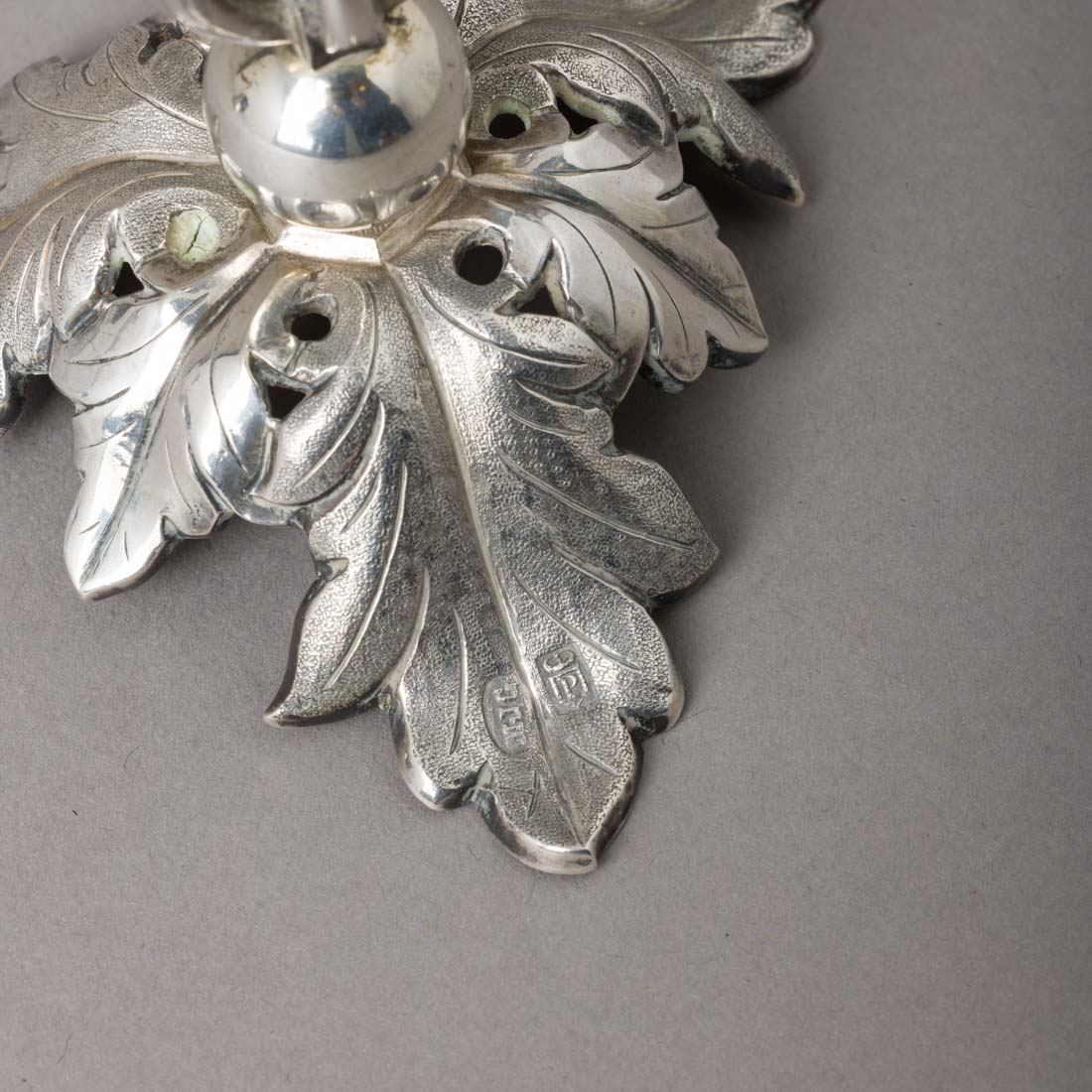 Em prata portuguesa do Séc. XIX, marca de ensaiador do Porto (P-61) José Rodrigues Teixeira e de ourives (P-478) datável de 1853-1877, decoração relevada. Pequenas amolgadelas.