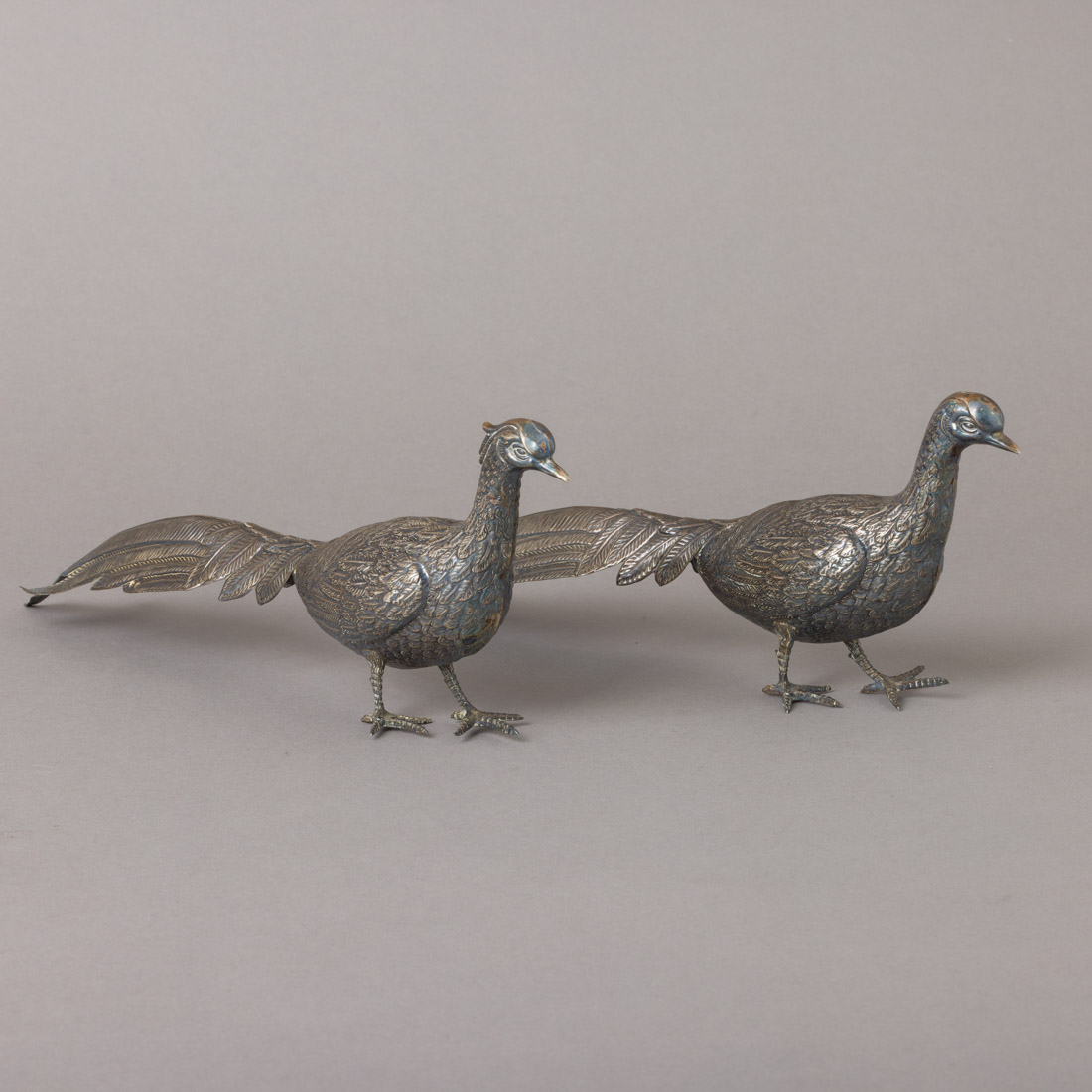 Esculturas em prata espanhola de 915 marcas de garantia de teor (pós 1934), decoração relevada. Sinais de uso, leves amolgadelas nas caudas.