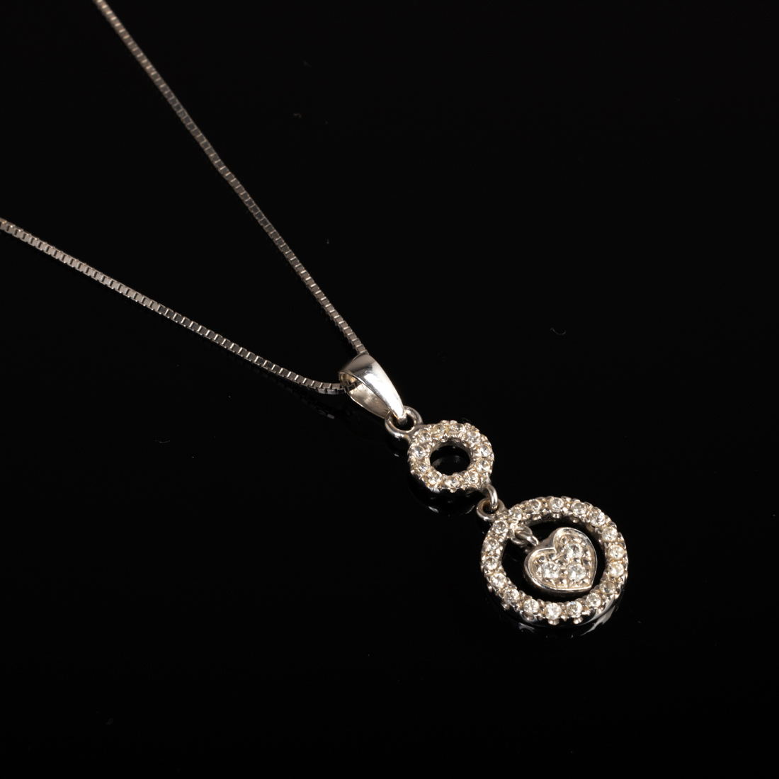 Em ouro branco de 9Kt., contraste andorinha (pós 1985), pendente em ouro branco de 14Kt., cravejado com zircónias, sem marcas, ao abrigo do Decreto-Lei n.º 120/2017. Sinais de uso.