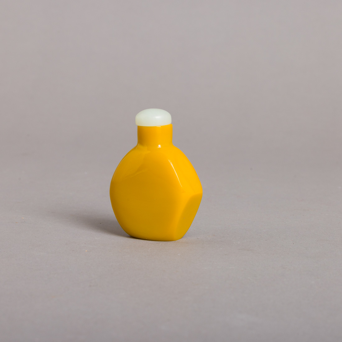 Em vidro de amarelo de formato hexagonal, tampa branca. Chinês. Sinais de uso.