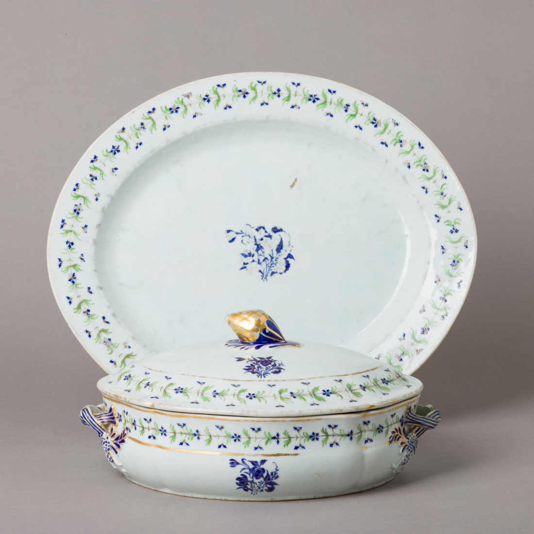 Em porcelana da China Companhia das Índias, Séc. XIX, decoração policromada e dourada "flores". Desgaste e asa com restauro.