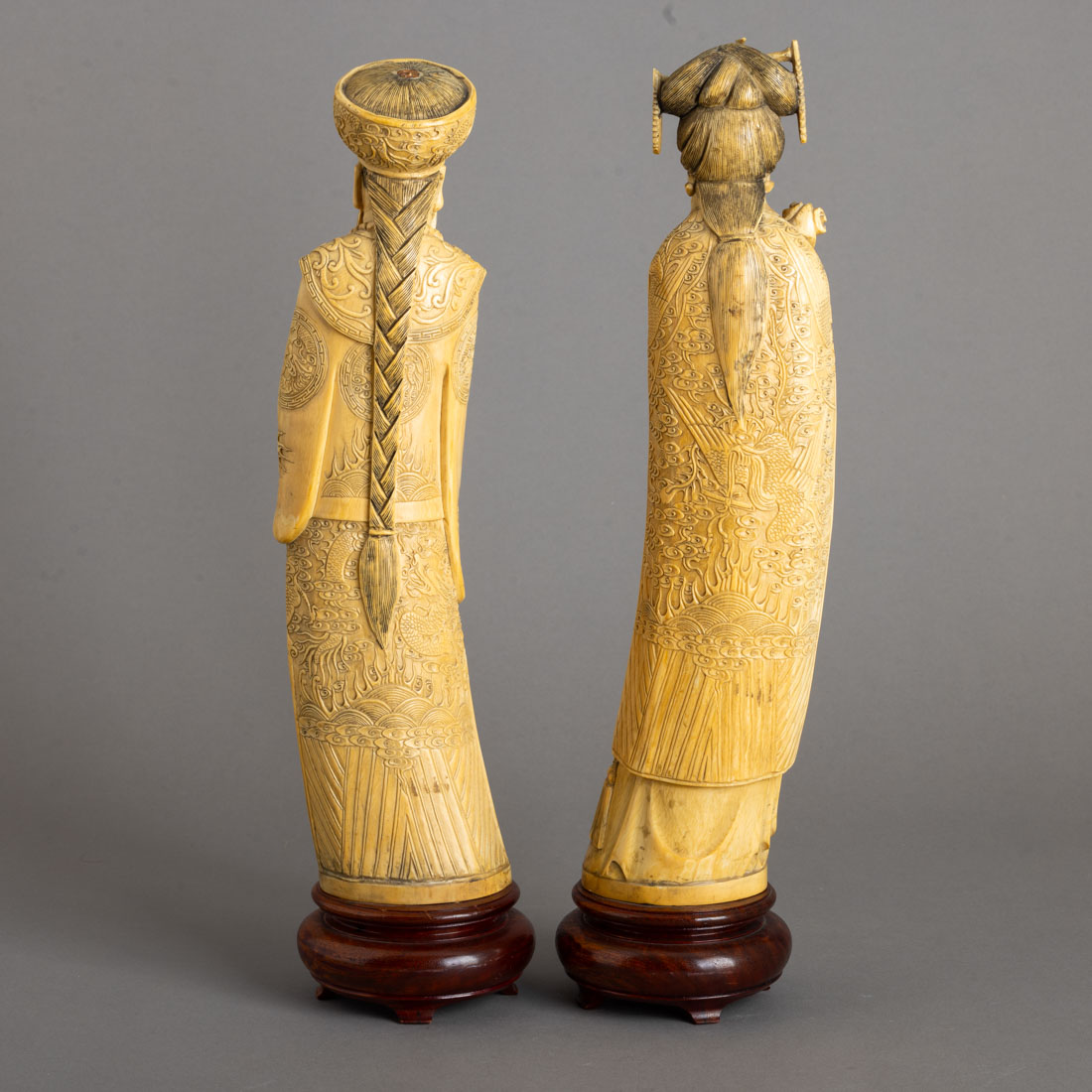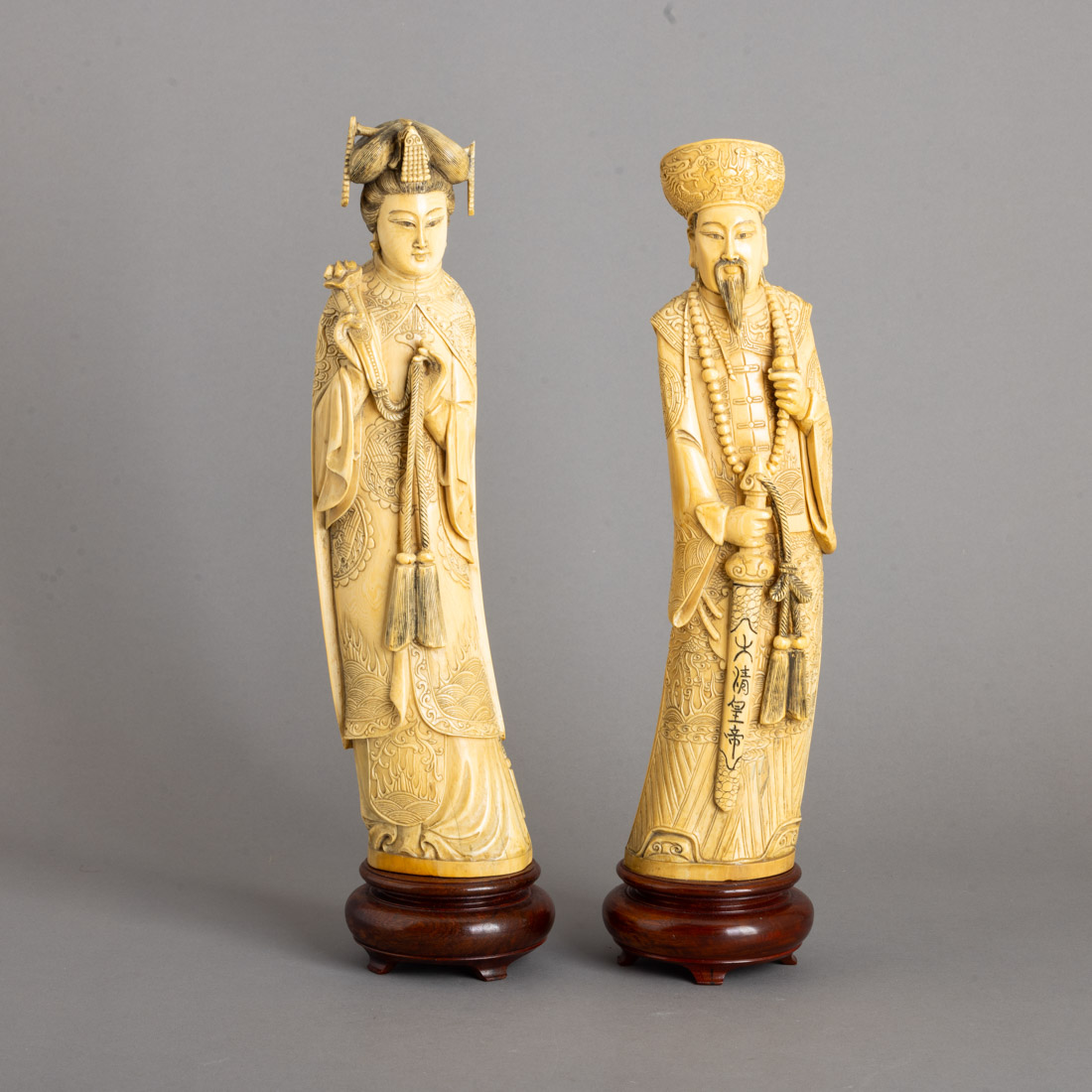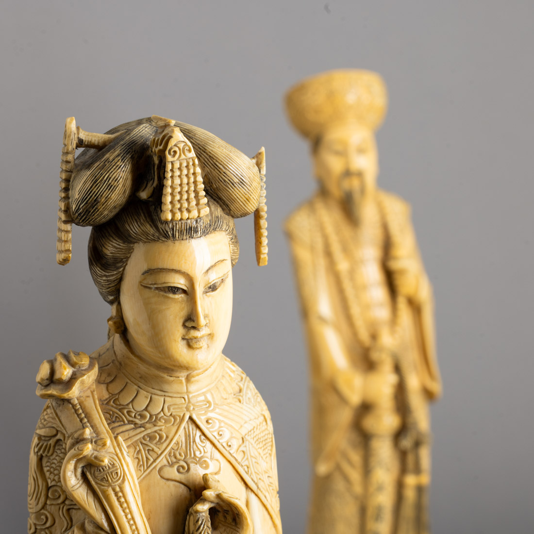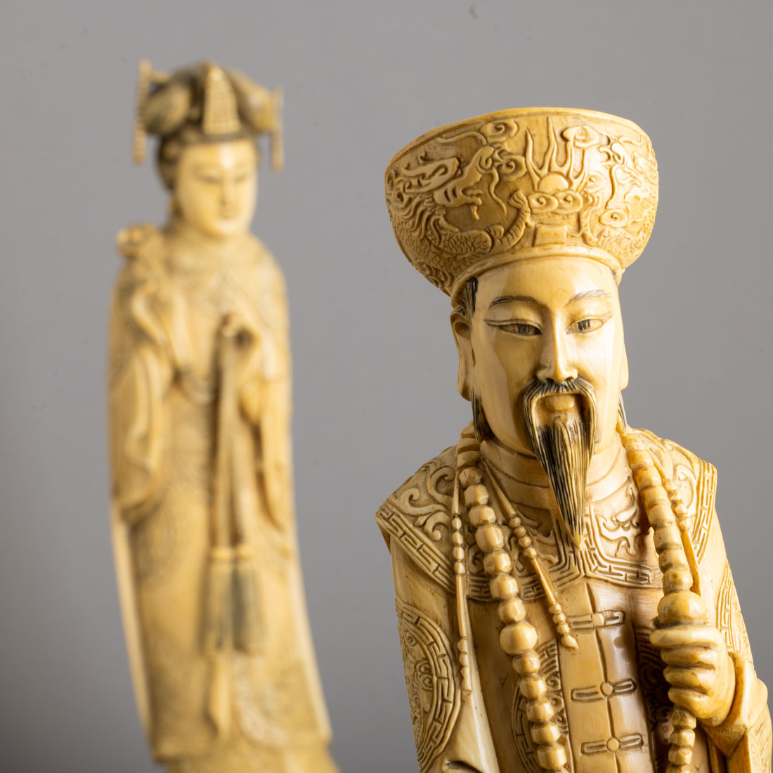 Esculturas em marfim, China, Séc. XX, período Minguo, representando casal de imperadores com atributos, com bases em madeira. Sinais de uso e falhas.
