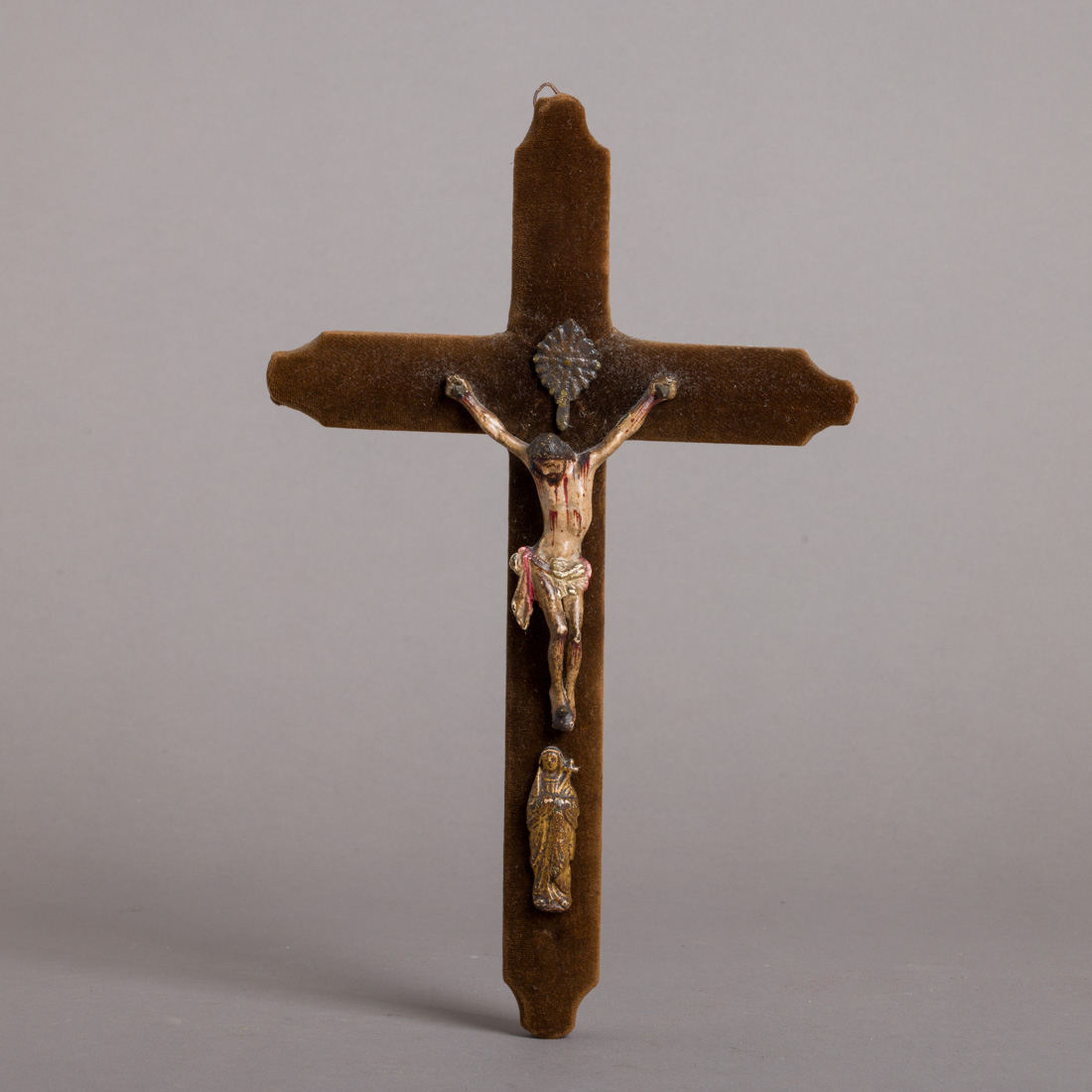 Esculturas em chumbo, decoração policromada, cruz revestida a veludo castanho. Sinais de uso.