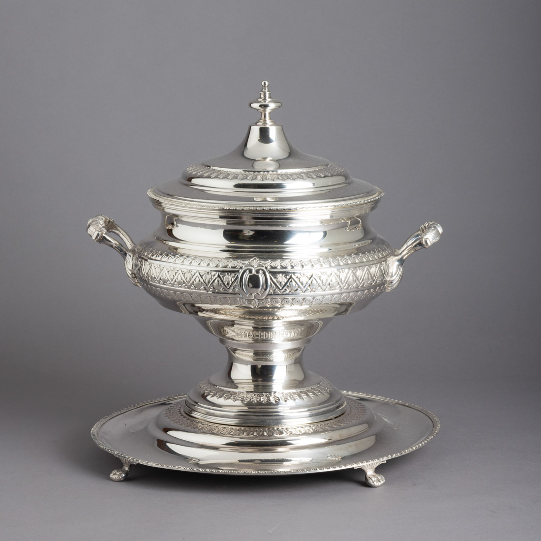 Em casquinha marcada Topázio, decoração relevada e gravada com motivos vegetalistas, pés de garra. Sinais de uso.