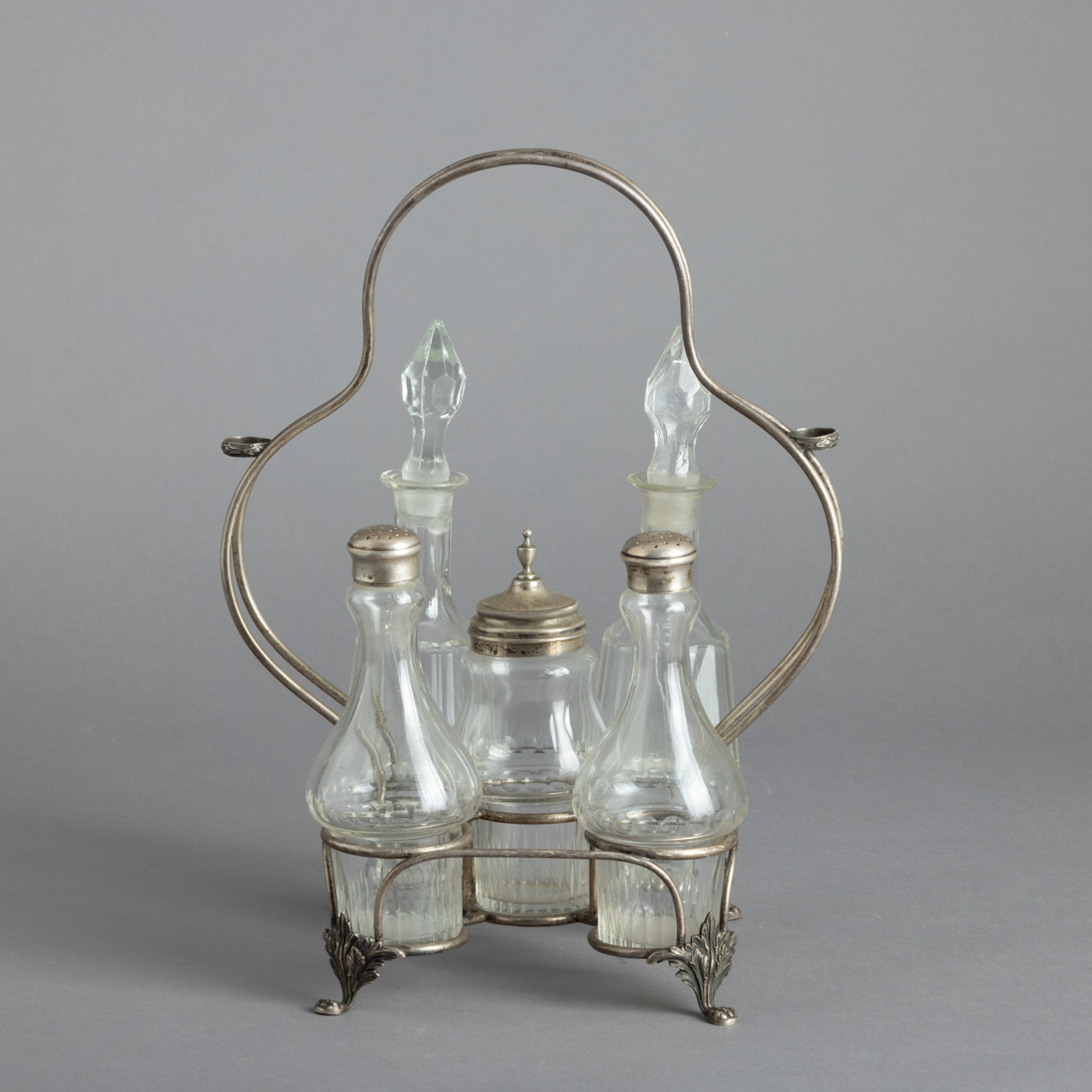 Em prata portuguesa contraste javali (1887-1937) de 833, pés relevados com elementos vegetalistas e garra, recipientes em vidro, galhetas diferentes, uma com esbeiçadelas no bordo.