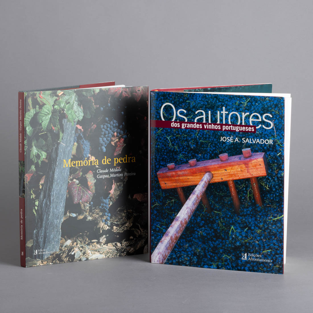 "Os autores dos grandes vinhos portugueses" de José A. Salvador e ""Memórias de pedra" de Claude Medalhe e Gaspar Martins Pereira. Edições Afrontamento. Encadernação de editor. Sinais de uso.
