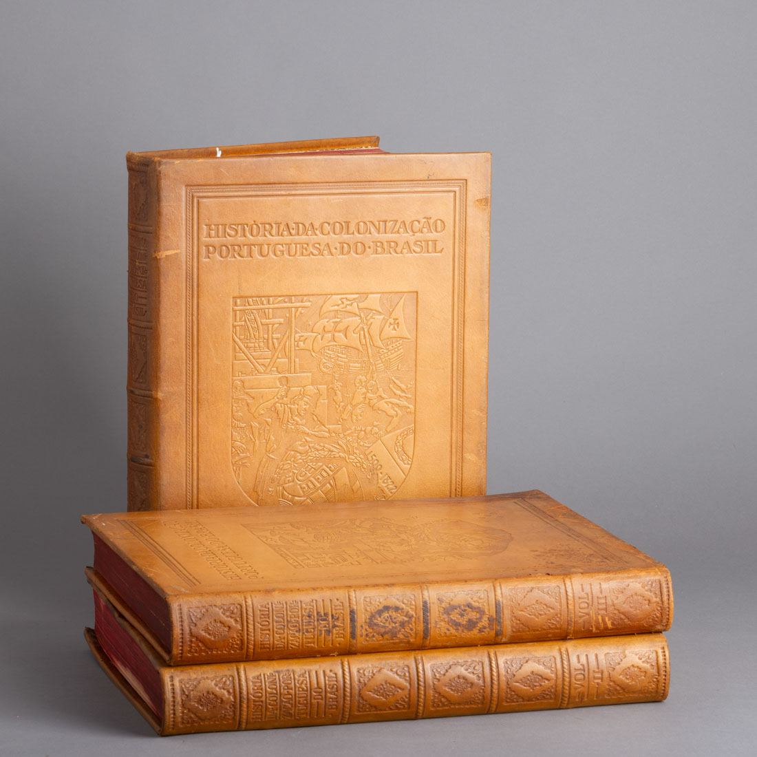 Edição monumental comemorativa do primeiro centenário da Independência do Brasil. Publicada pela Litografia Nacional, entre 1921 e 1924. Direcção e coordenação literária de Carlos Malheiro Dias. Direcção cartográfica do conselheiro Ernesto de Vasconcelos.Direcção artística de Alfredo Roque Gameiro. Profusamente ilustrados com reprodução de manuscritos, mapas, pinturas e gravuras antigas. Três volumes. Encadernação a pele. Sinais de uso e manchas.