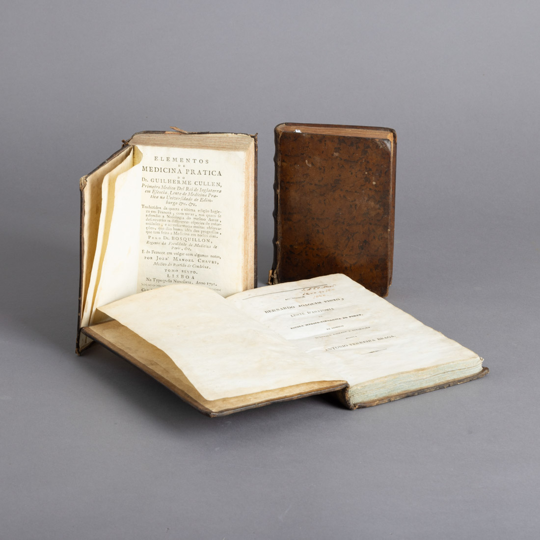 "Aviso ao povo sobre a sua saúde" por Mar. Tisso; "Elementos de medicina pratica" do Dr. Guilherme Cule e "Patologia geral" Bernardo Joaquim Pinto. Encadernados. Pequenos defeitos e picos de acidez.