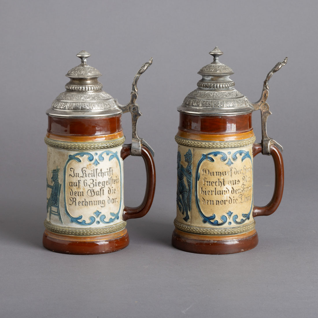 Em cerâmica vidrada, decoração policromada com cenas de taberna e inscrição. Tampas em metal prateado relevada com elementos vegetalistas e figura. Sinais de uso.