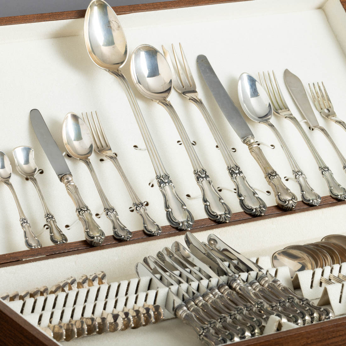 Em prata portuguesa contraste águia (1938/84) de 833, decoração relevada com enrolamentos. Composto: 12 talheres de carne, 12 de peixe, 12 de sobremesa, 12 colheres de sopa, 12 de sobremesa, 6 de chá, 6 de café, 3 talheres de servir e concha de açúcar. Peso total aprox.: 5870 g.
