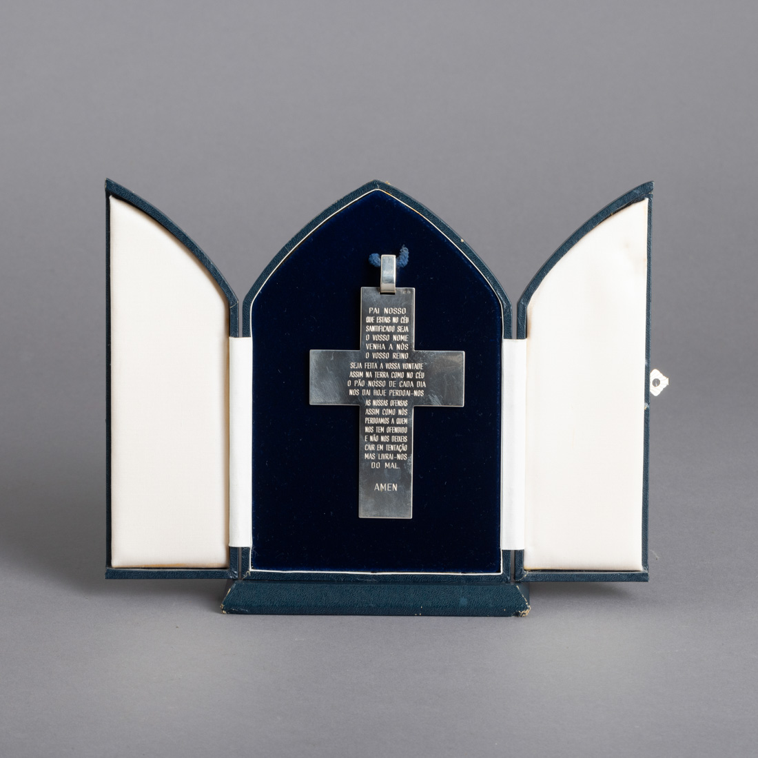 Em prata portuguesa contraste águia (pós 1985) de 835, decoração gravada com oração "Pai Nosso", datado no verso, em estojo capela. Sinais de uso, estojo com pequenos defeitos.