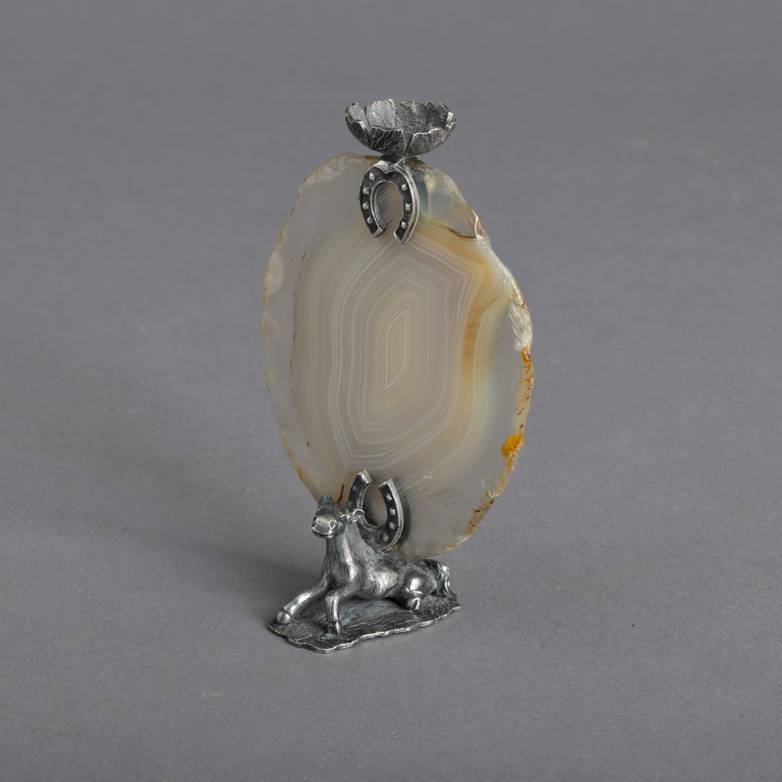 Escultura em prata e placa em ágata. Sem marcas, ao abrigo do Decreto-Lei n.º 120/2017. Sinais de uso.