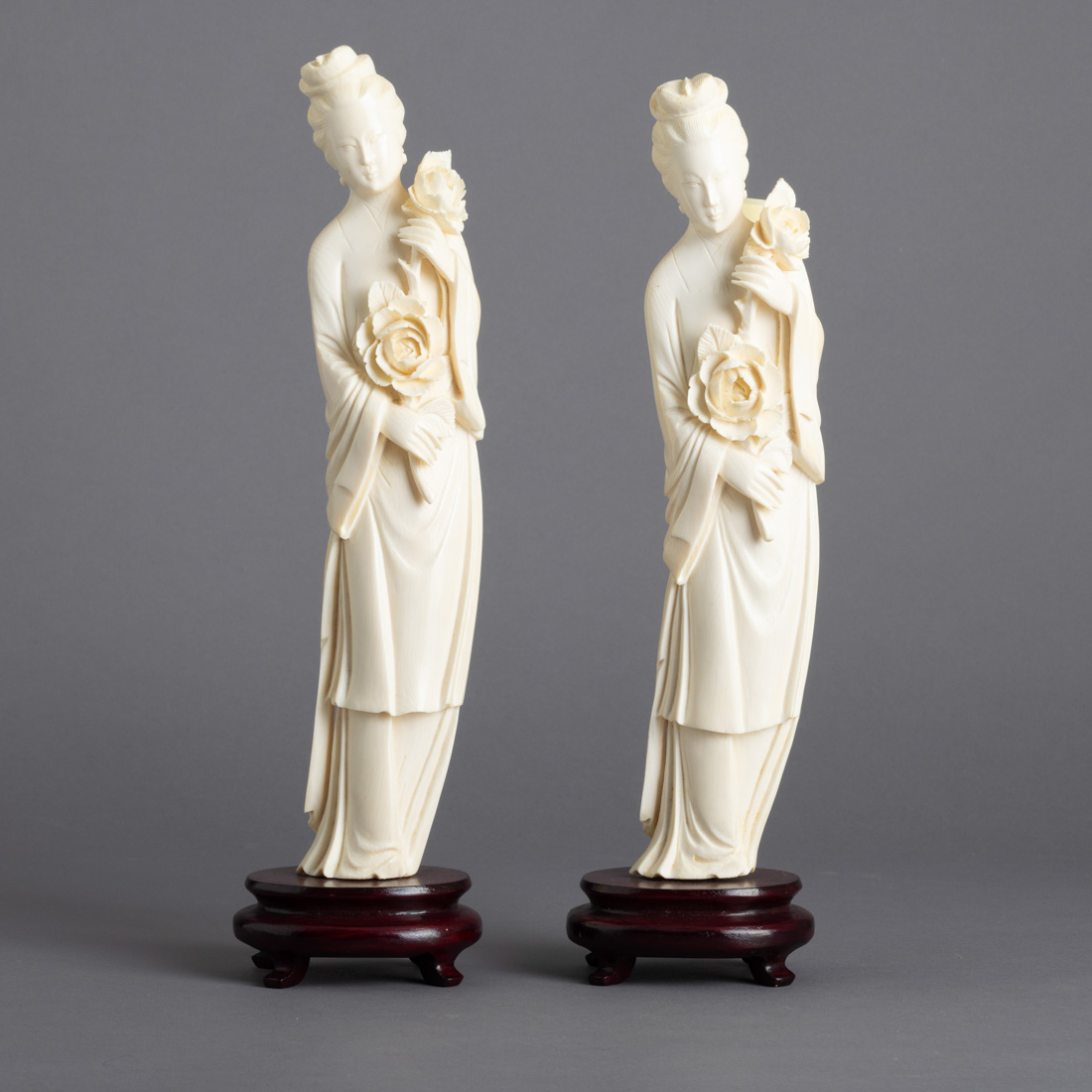 Esculturas em marfim, bases em madeira. China, Séc. XX.