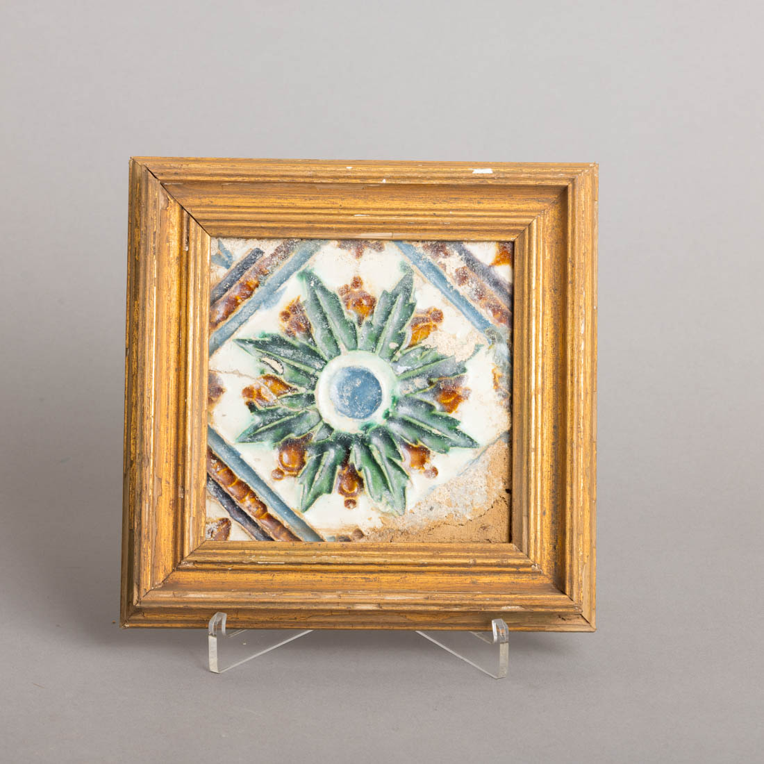 Em cerâmica vidrada, decoração relevada e policromada "florão". Hispano-árabe. Séc. XVI. Emoldurado. Falhas e defeitos.