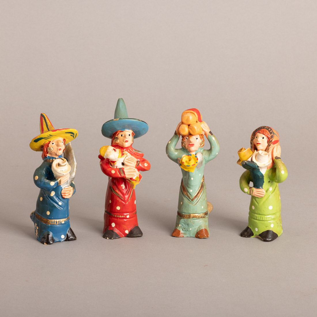 Esculturas em barro de Barcelos, decoração policromada, assinadas, duas com assobio. Sinais de uso e duas com pequenas esbeiçadelas.