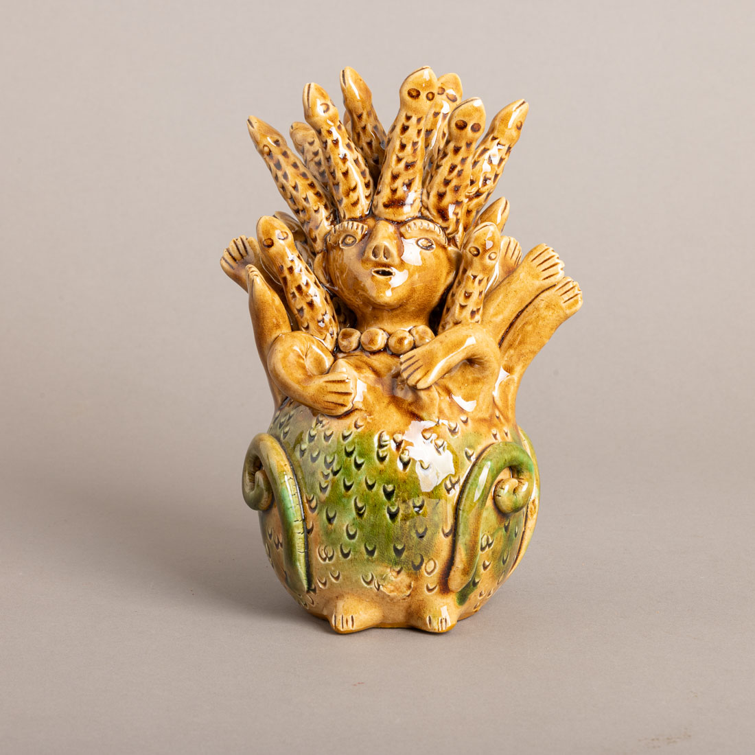 Escultura em barro vidrado, decoração policromada, assinada. Sinais de uso e ínfima esbeiçadela.